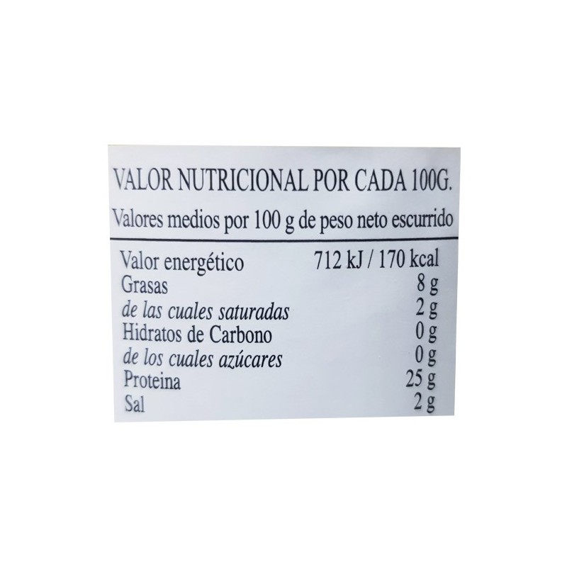 Filetes de Ventresca de atún claro, aceite de girasol y sal. Conservar en lugar fresco y seco. Zona de pesca: FAO 87. Una vez abierto, cambiar el contenido a un envase no metálico y mantener refrigerado.