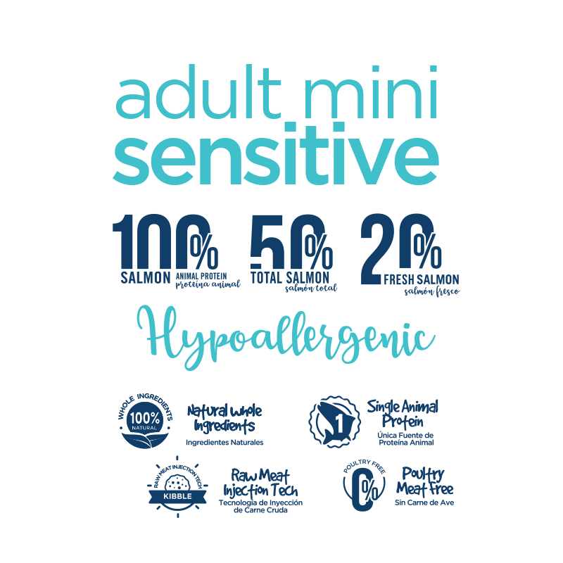 El salmón, ingrediente principal del Fresh Mediterranean Blend Adult Mini Sensitive, es fuente rica en Omega 3 y 6, y esto hace que se reduzcan las alergias cutáneas, previene problemas de articulaciones y optimiza el sistema inmunológico. Los beneficios de elegir el pienso Adult Sensitive de Fresh Mediterranean Blend son inmumerables para la salud de tu perro, especialmente si tiene la piel y el estómago sensible.