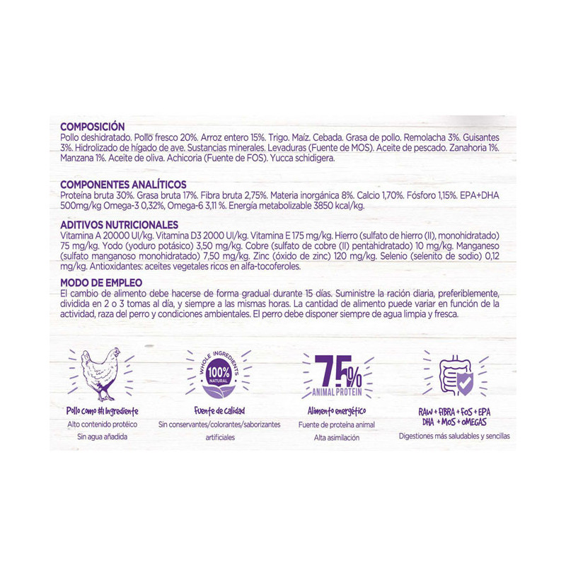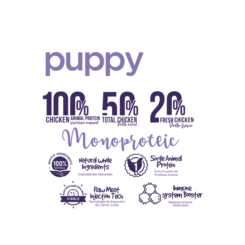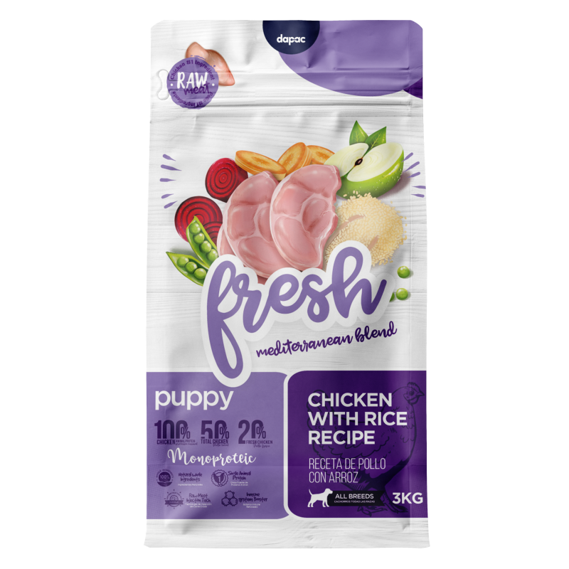La variedad Puppy de Fresh Mediterranean Blend está especialmente diseñada para cachorros de todas las razas. La receta incluye verdadero pollo e ingredientes naturales que proporcionan al cachorro digestions mucho má sencillas. Sus principales ingredientes son pollo deshidratado, pollo fresco 20%, arroz entero y guisantes.