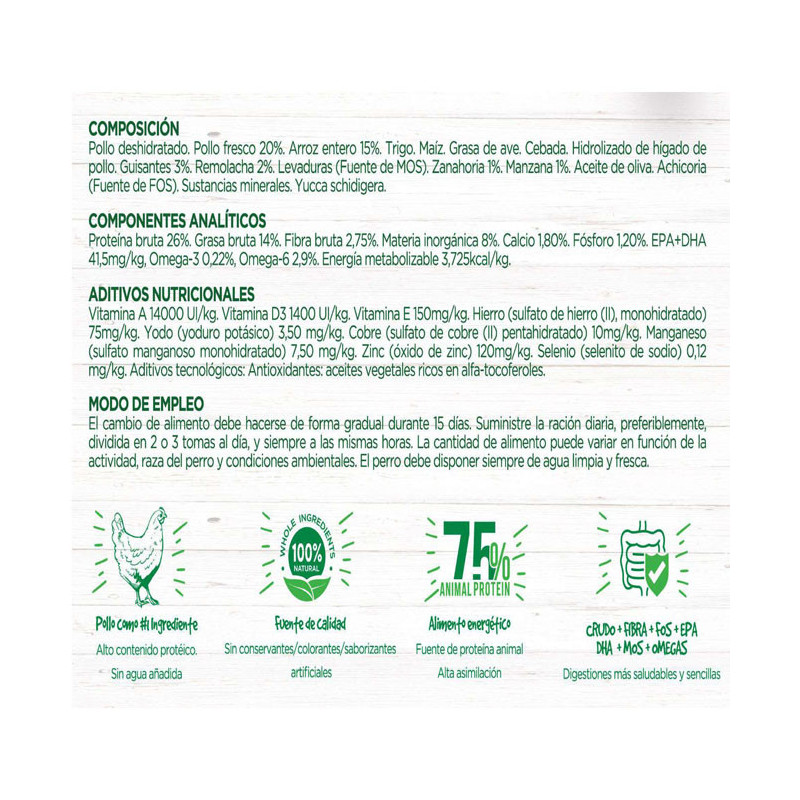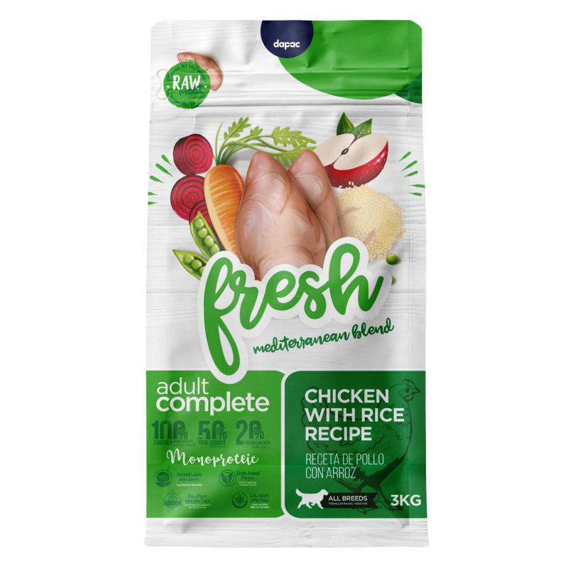 La variedad Adult Complete de Fresh Mediterranean Blend es una receta pensada para perros de todas las razas en edad adulta. La receta contiene verdadero pollo y es bajo en cereales. Sus principales ingredientes son pollo deshidratado, pollo fresco 20% y arroz.