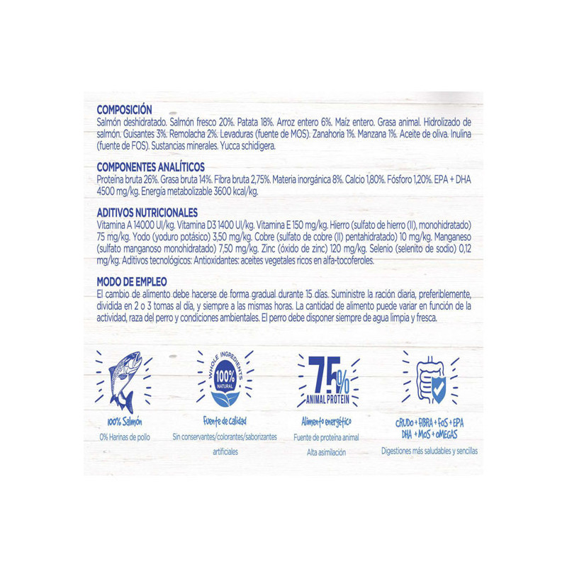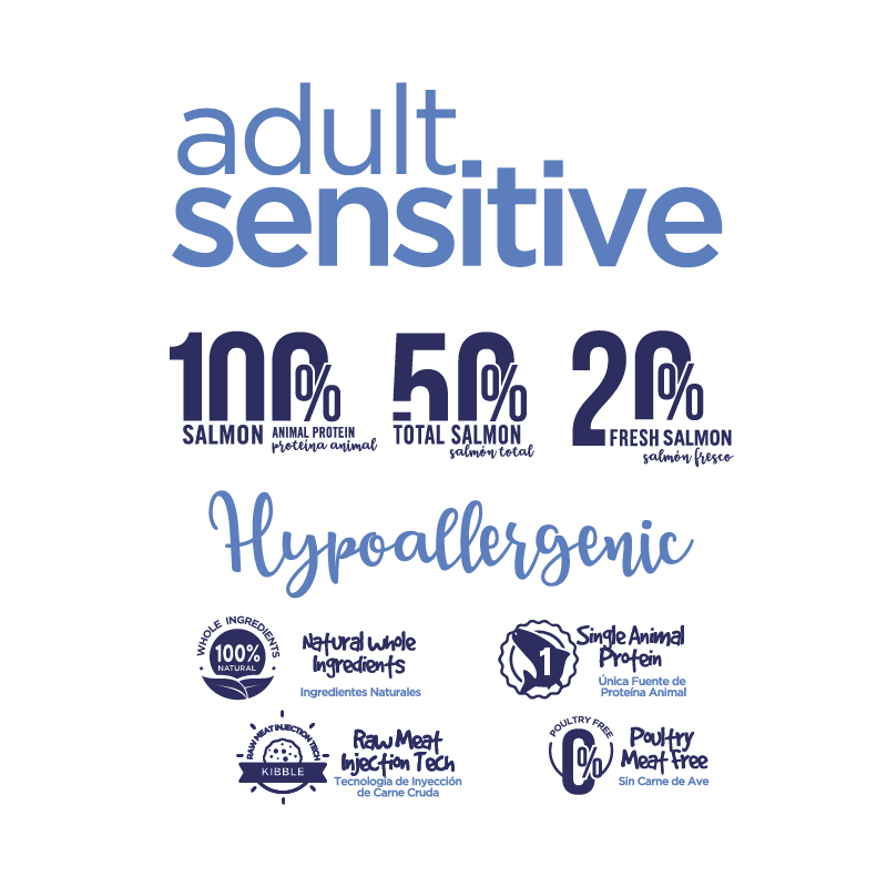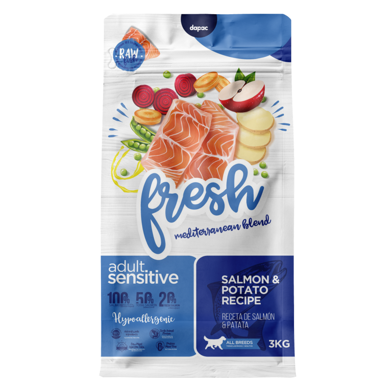 La variedad Adult Sensitive de Fresh Mediterranean Blend es una receta pensada especialmente para perros adultos de todas las razas. La receta incluye verdadero salmón y no contiene harina de carne o pescado. Sus principales ingredientes son salmón deshidratado, salmón fresco 20%, patata y arroz.