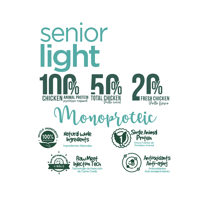 Senior Light es la variedad alimenticia de Fresh Mediterranean Blend especialmente indicada para perros adultos (senior, de edad avanzada) de cualquier raza. La receta contiene verdadero pollo, ingredientes naturales y además tiene bajo contenido en grasas, por lo que es ideal para perros con tendencia al sobrepeso. Sus principales ingredientes son pollo deshidratado, pollo fresco 20%, arroz entero y guisantes.
