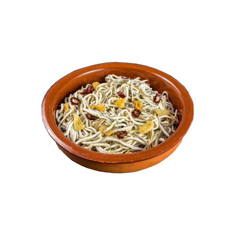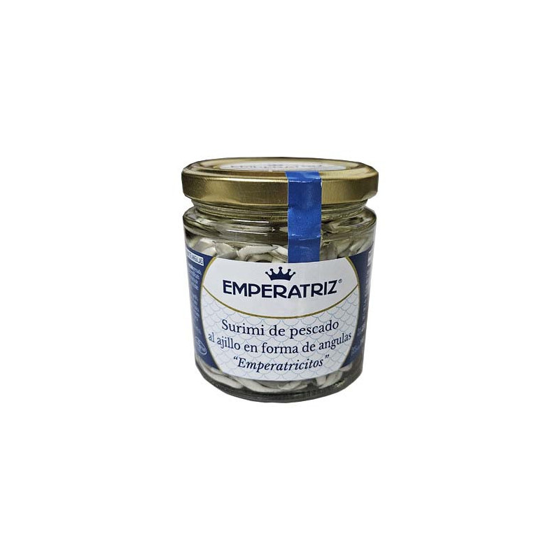 Surimi de angulas al ajillo tarro de 250 g. preparado para verter directamente a la sartén. Producto muy versátil en la cocina con un alto valor nutricional y muy bajo en calorías y grasas, además de tener poco colesterol. Se trata de uno de los platos más populares de la cocina vasca, que históricamente se ha preparado con angulas frescas, pero debido al elevado precio que ha alcanzado este pescado en los últimos años, se desarrolló un sucedáneo denominado “surimi”. Éste se obtiene de la mezcla de distintos pescados a la que se le da el sabor, la forma y el color de las angulas.