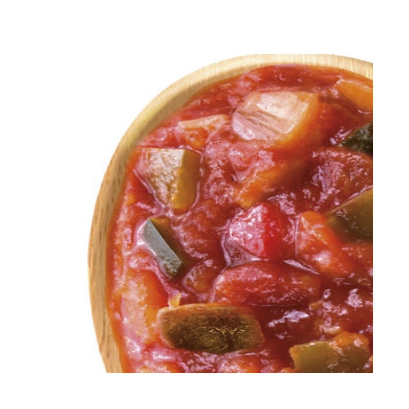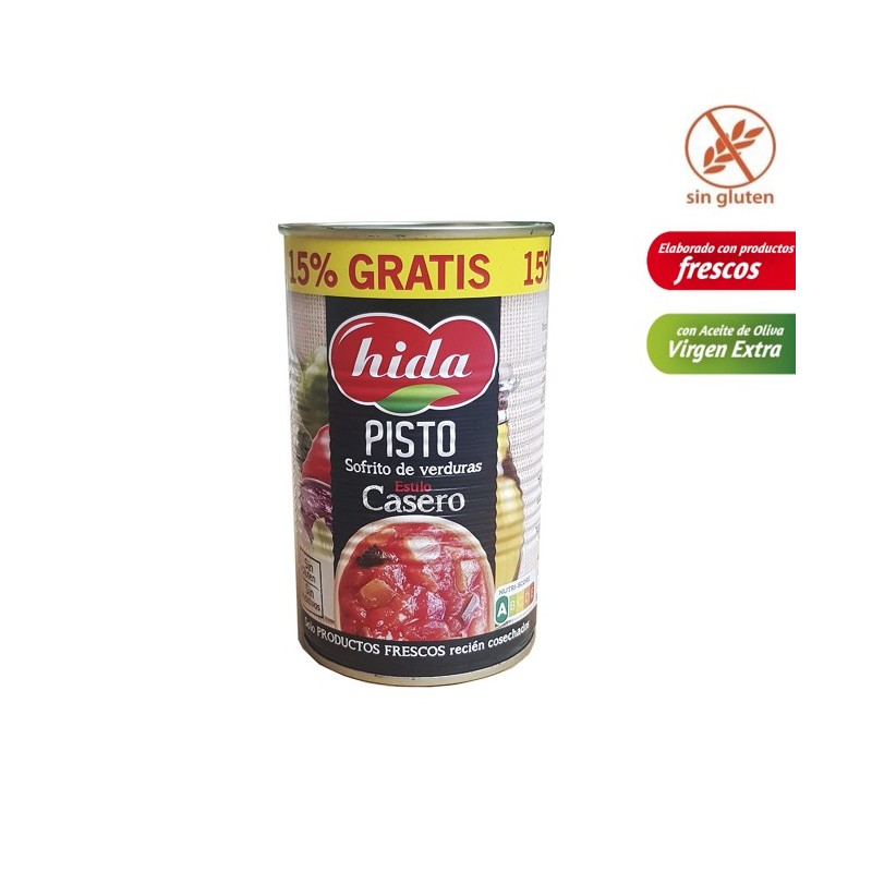 El pisto de verduras de Hida está elaborado exclusivamente a partir de la selección de los mejores productos frescos de la huerta: calabacín, berenjena, pimiento, cebolla y las mejores variedades de tomate en su punto óptimo de maduración. Cocinado a fuego lento durante más de 2 horas con aceite de oliva virgen extra y sazonado con la cantidad justa de azúcar y sal. Resulta un plato saludable, acompañamiento para innumerables recetas (huevos, carnes, pescados,..) de Auténtico Sabor Casero.