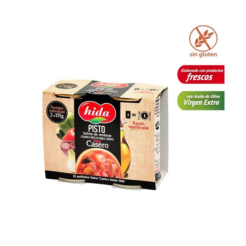 El pisto de verduras de Hida está elaborado exclusivamente a partir de la selección de los mejores productos frescos de la huerta: calabacín, berenjena, pimiento, cebolla y las mejores variedades de tomate en su punto óptimo de maduración. Cocinado a fuego lento durante más de 2 horas con aceite de oliva virgen extra y sazonado con la cantidad justa de azúcar y sal. Resulta un plato saludable, acompañamiento para innumerables recetas (huevos, carnes, pescados,..) de Auténtico Sabor Casero.