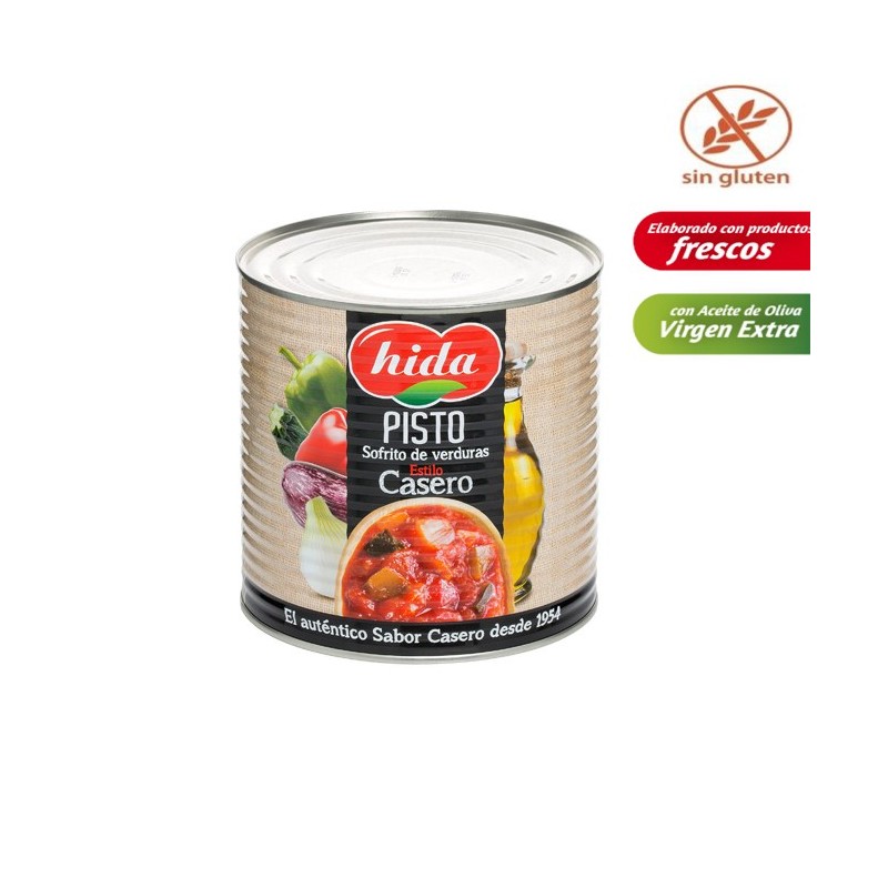 El pisto de verduras de Hida está elaborado exclusivamente a partir de la selección de los mejores productos frescos de la huerta: calabacín, berenjena, pimiento, cebolla y las mejores variedades de tomate en su punto óptimo de maduración. Cocinado a fuego lento durante más de 2 horas con aceite de oliva virgen extra y sazonado con la cantidad justa de azúcar y sal. Resulta un plato saludable, acompañamiento para innumerables recetas (huevos, carnes, pescados,..) de Auténtico Sabor Casero.