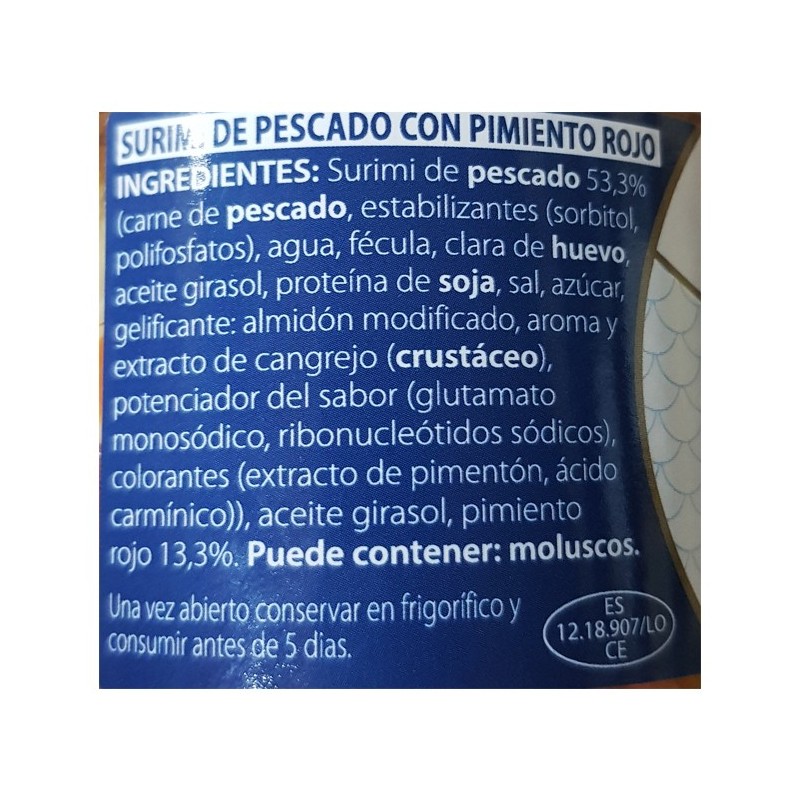 Surimi de pescado sabor cangrejo con pimiento rojo. Palitos de cangrejo ya cortados con pimiento en pequeños trozos que le dan aún mas sabor. Producto con origen nacional y de elaboración artesana.