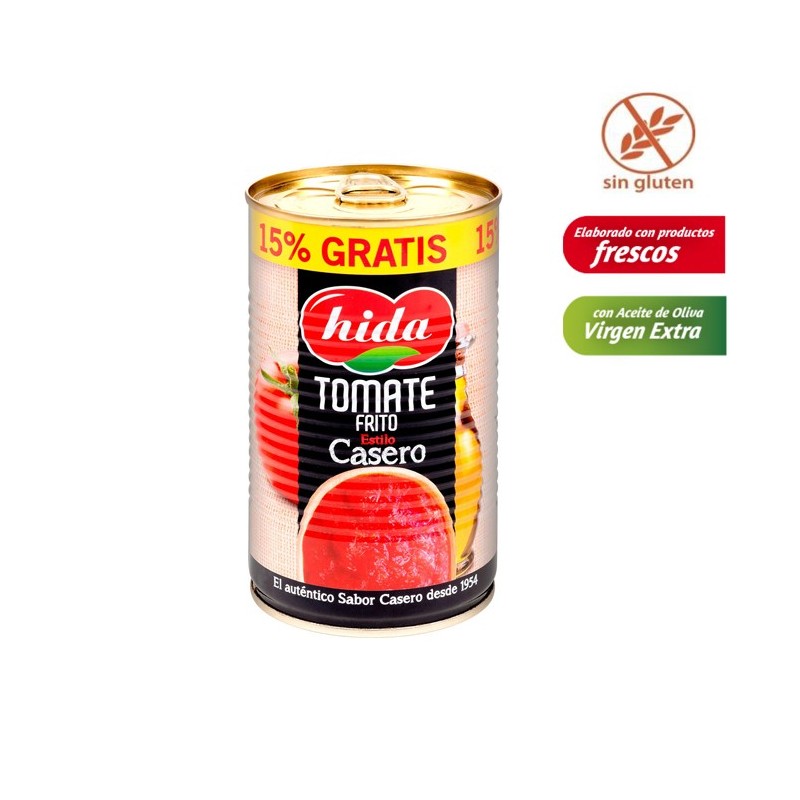 El Tomate Frito Estilo Casero de Hida está elaborado con la mejor selección de tomates frescos 100% de temporada recogidos en su punto óptimo de maduración. Cocinados durante más de 2 horas con aceite de oliva virgen extra y sazonado con la cantidad justa de azúcar y sal. El resultado es un producto de alto valor añadido, de exquisito sabor al paladar y de gran calidad en la elaboración de cualquier receta.