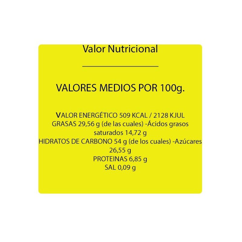 Ingredientes: Harina de trigo, azúcar, grasa animal, almendras seleccionadas (8%), grasa vegetal (girasol), cacao (6%), leche, aroma de vainilla, emulgente (lecitina de soja) y antioxidantes (E-304 y E-306).