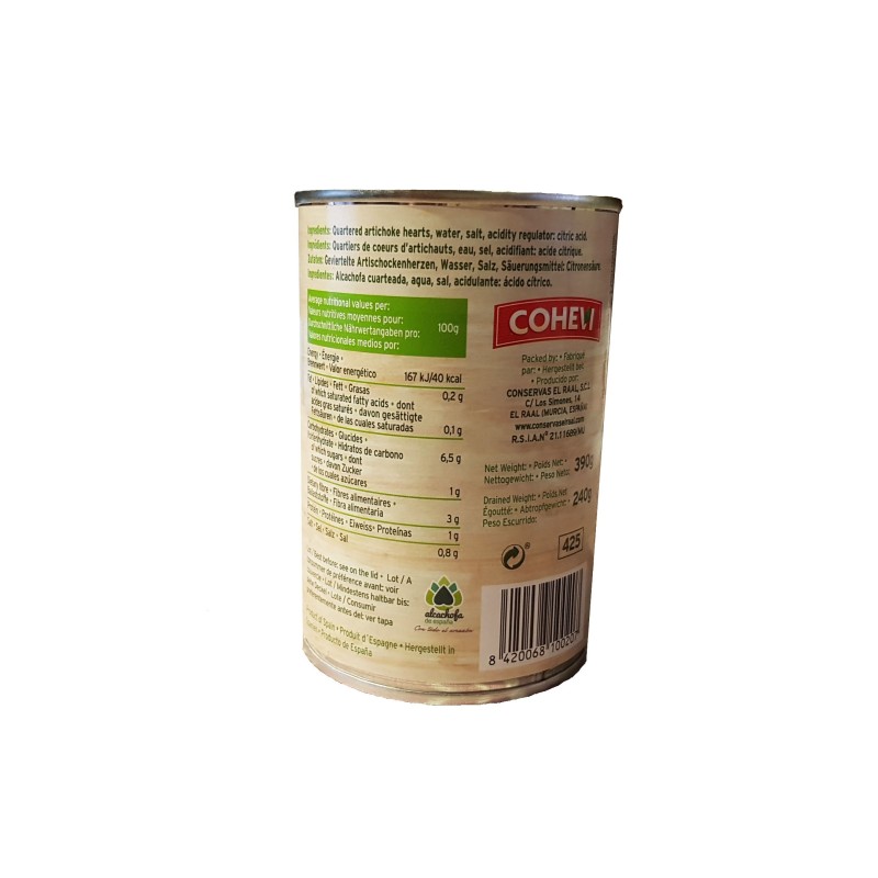 Ingredientes: Alcachofa cuarteada, agua, sal y acidulante: ácido cítrico.
